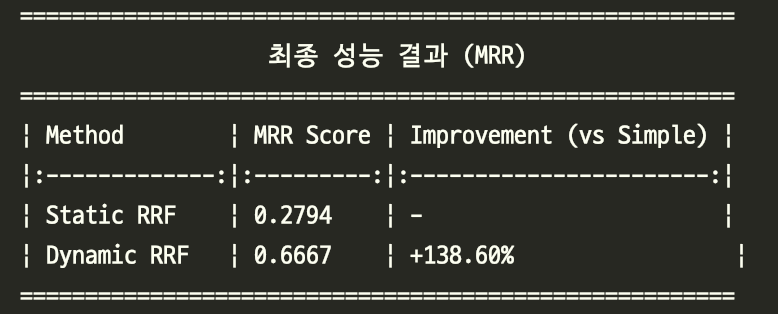 - 동적 가중치 RRF: 의도에 따라 강점을 가진 엔진에 힘을 실어줌으로써, 두 상황 모두에서 최적의 결과를 도출했습니다.